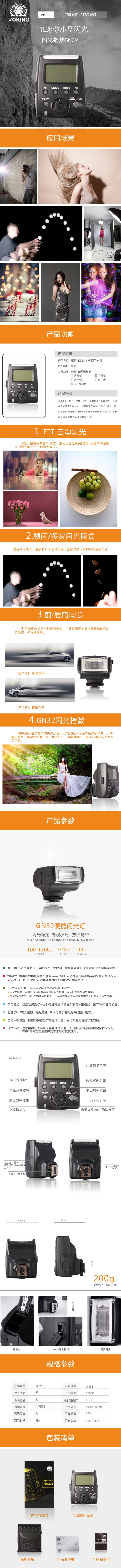 ◆ VK320是一款小巧便攜又功能豐富的機頂閃光燈,體積只有其他閃光燈體積的1/3大小,該燈配備了自動(dòng)TTL閃光、手動(dòng)、頻閃等模式,同時(shí)兼具閃光包圍和曝光補償的輔助功能,用" 麻雀雖小,五臟俱全"來(lái)形容它恰到好處。